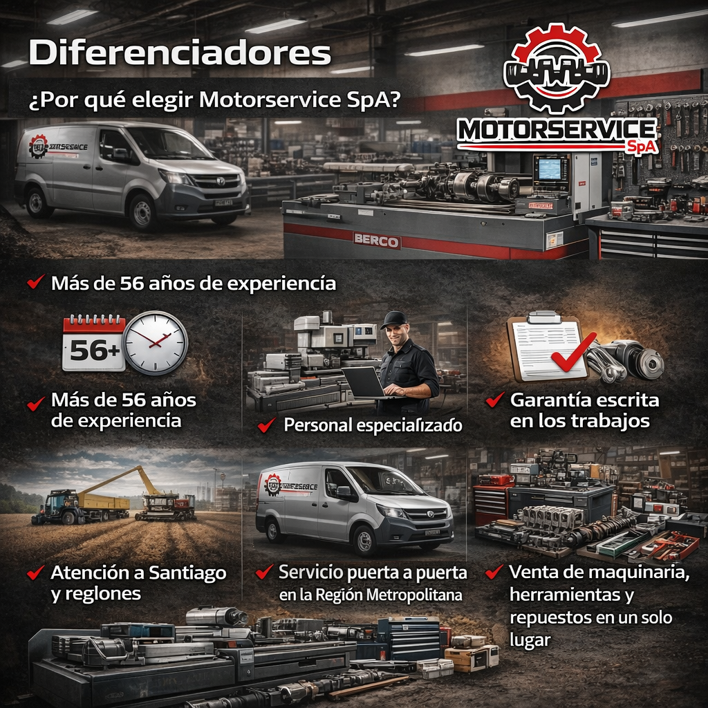 Si necesitas rectificación de motores, recuperación de componentes, maquinaria para taller, herramientas o repuestos, en Motorservice SpA te entregamos experiencia, respaldo y atención especializada.